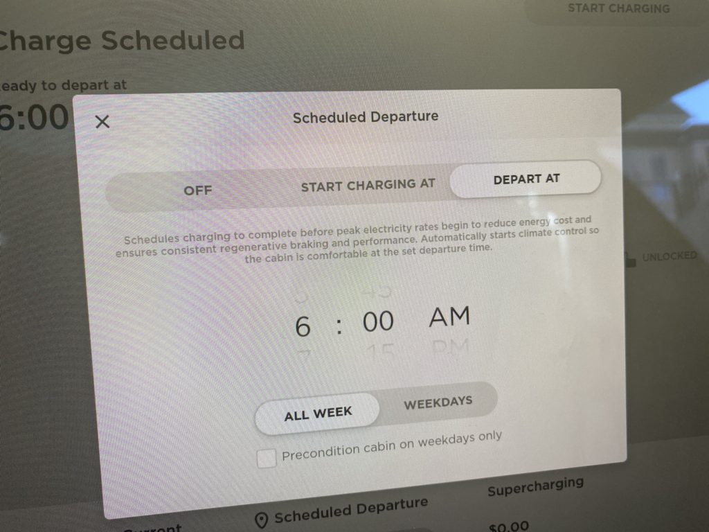 If your daily routine is relatively predictable, set up scheduled departure times. This will set your car so that it finishes charging as you are about to leave. From the battery’s perspective, this has the dual benefit of not letting the car sit at full charge for very long, as well as optimizing the battery temperature before you leave. It’s also nice to have the climate control precondition the cabin, and have that heating and cooling happen while you are still plugged in to the wall.